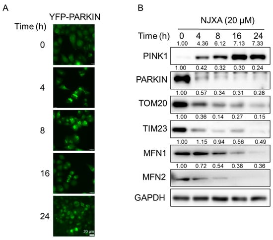 NJXA promotes Parkin-dependent mitophagy in HeLa cells. (A) YFP-Parkin HeLa cells were treated with NJXA (20 μM) for 0–24 h, and the distribution of YFP-Parkin was examined by immunofluorescence microscopy. Scale bar = 20 μM. (B) HeLa cells treated with NJXA (20 μM) for 0–24 h were analyzed by immunoblotting for PINK1, PARKIN, TOM20, TIM23, MFN1, and MFN2. GAPDH was served as loading control. The values above the bands indicate the relative 669 band intensities. Data are presented as the means ± SD of three independent experiments.