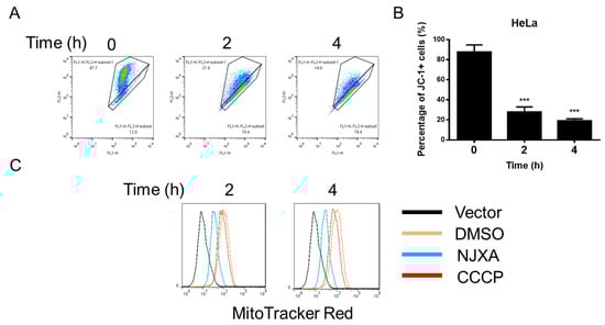 After treatment with NJXA for 0–4 h, HeLa cells (2 × 105) were incubated with 100 nM MitoTracker Red (Thermo Fisher, Waltham, MA, USA) in the dark for 30 min at 37 °C. Cells were then washed with precooled PBS. The fluorescence of the cells was analyzed by flow cytometry.