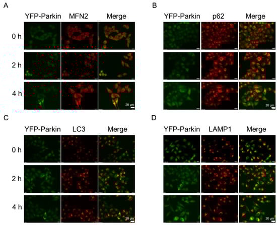 Upon mitochondrial depolarization, PINK1 stabilizes on the outer mitochondrial membrane and recruits its RBR-type E3 ubiquitin ligase Parkin. Parkin is phosphorylated and then ubiquitinates proteins, such as the mitochondrial fusion proteins MFN1, MFN2, and voltage-dependent anion channels (VDACs) [12,14]. MFN2 localizes on the outer membrane of mitochondria and can be used to indicate the mitochondrial position. To address whether NJXA promotes Parkin recruitment to mitochondria, we treated YFP-Parkin HeLa cells with NJXA. As demonstrated in Figure 3A, NJXA significantly induced colocalization of Parkin (green) and MFN2 (red), suggesting that it promoted Parkin transfer to mitochondria. The autophagic protein p62 has been reported to be a missing link between ubiquitylation and mitophagy, whereby p62 binds to LC3 on the phagophore and modulates mitophagy [15]. We next investigated whether NJXA promoted the recruitment of p62 and LC3 to the mitochondria. Treatment with NJXA significantly enhanced the colocalization of Parkin with p62 and LC3, suggesting that the autophagy receptor p62 is recruited to damaged mitochondria to drive mitophagy (Figure 3B,C). Taken together, these data suggest that NJXA promotes Parkin-dependent mitophagy following the recruitment of the autophagy receptor p62.