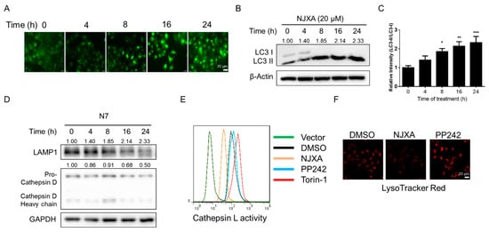 As autophagosome accumulation can be detected by observing LC3 puncta formation, we observed LC3 conversion in NJXA-treated GFP-LC3 HeLa cells. Fluorescence microscopy images revealed that GFP puncta accumulated after NJXA treatment in a time-dependent manner (Figure 4A). LC3-II is specifically associated with autophagosome membranes, and the transformation from LC3-I to II is correlated with the extent of autophagosome formation [16]. As shown in Figure 4B,C, NJXA treatment increased the amount of LC3-II/I in a time-dependent manner, which is consistent with the fluorescence analysis findings. As we already identified that NJXA induced colocalization of Parkin and LC3, these results confirm that NJXA induced mitochondria–autophagosome fusion.