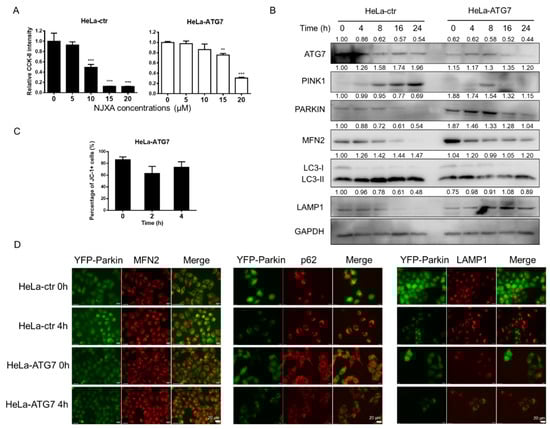 The reduction in mitochondrial membrane potential (MMP) in damaged mitochondria leads to the accumulation and activation of PINK1 on the outer mitochondrial membrane and activates mitophagy [12]. Therefore, we detected MMP in NJXA-treated HeLa cells. As shown in Figure 2A,B, NJXA treatment for 2 h resulted in the loss of MMP. When PINK1-activated Parkin is recruited to mitochondria, it modulates the process of mitophagy by causing a decrease in mitochondrial mass, finally resulting in the elimination of damaged mitochondria [13]. MitoTracker, a fluorescent dye directly accumulated on active mitochondria, was used to detect the mass of mitochondria. As shown in Figure 2C, NJXA markedly reduced the red fluorescence intensity of MitoTracker Red, indicating decreased mitochondrial mass. Although CCCP (carbonyl cyanide 3-chlorophenylhydrazone) is a widely accepted mitophagy inducer, the effect of CCCP on decreasing mitochondrial mass of HeLa cells was not significant as expected. On the contrary, the effect of NJXA on decreasing MitoTracker fluorescence was far more significant, indicating that NJXA was a better mitophagy inducer than CCCP from this aspect. Taken together, NJXA depolarizes mitochondria and initiates mitophagy in cervical cancer HeLa cells.