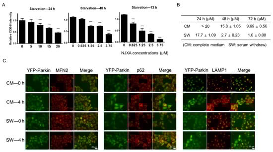 It has been reported that nutrient deprivation induces mitophagy [20]. To further confirm that NJXA induces cervical cancer cell death by inducing mitophagy, we treated nutrient-deprived HeLa cells with NJXA. The results of the CCK-8 (Cell Counting Kit-8) assay suggest that NJXA was more sensitive to HeLa cells under starvation conditions (Figure 6A). The difference between the IC50 (50% inhibition concentration) of NJXA in complete medium and nutrient-deprived conditions is shown in Figure 6B. Following a 72 h treatment, for example, NJXA (3.75 μM) had nearly no effect on complete-medium-cultured HeLa cells but inhibited more than 90% of cell proliferation under starvation conditions. To further detect the effect of NJXA on mitophagy induction under starvation conditions, immunofluorescence was performed. As shown in Figure 6C, we observed colocalization of Parkin with MFN2, p62, and LAMP1. The yellow section of colocalization analysis showed a nutrient deprivation-enhanced effect of NJXA. These results suggest that NJXA inhibited cervical cancer cell proliferation under nutrient starvation even more effectively than sufficient nutrient supply, and the mechanism may be attributed to enhanced mitophagy under starvation conditions.