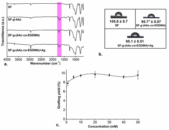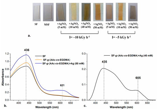 ) SF-g-(AAc-co-EGDMA) + Ag (50 mM); and (c) UV-Vis spectrum of SF-g-(AAc-co-EGDMA) + Ag (10 mM).