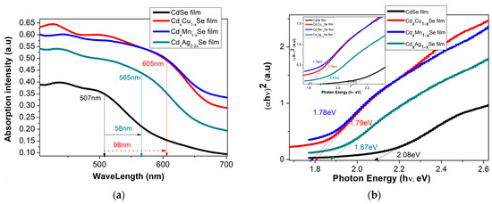 From the UV-Vis spectra, using the Tauc relation in Equation (1), we variously determined the Eg of the TiO2/CdS/CdxCu1−xSe, TiO2/CdS/CdxMn1−xSe, and TiO2/CdS/CdxAg2−2xSe films with dopants [16]