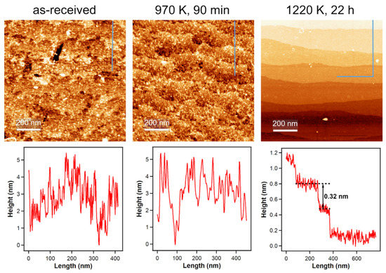 Ambient-condition AFM images of an untreated TiO2(110) surface and after annealing in air and corresponding height profiles (indicated by the blue lines in the AFM images). Annealing to 970 K, which is the annealing temperature for UHV-prepared crystals, does not yield flat surfaces. Increasing the annealing temperature to 1220 K for 22 h results in large terraces, indicating atomic ordering.
