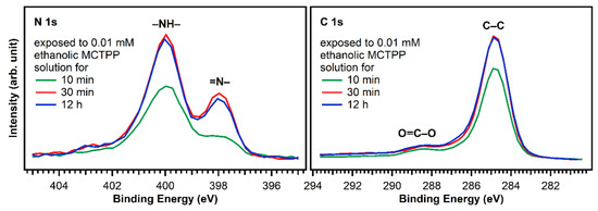 N 1s and C 1s spectra of TiO2(110) crystals exposed to ethanolic 0.01 mM MCTPP solution for 10 and 30 min and 12 h. After 30 min, the spectra do not change anymore, suggesting that saturation coverage is reached. The 10 min preparation has less nitrogen and carbon and therefore also a lower porphyrin coverage.
