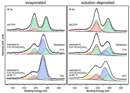 N 1s spectra of evaporated and solution-deposited layers of MCTPP onto TiO2(110) before and after metalation at room temperature and at 85 °C with aqueous zinc acetate solution. The blue peak is caused by the metalated porphyrin species and the yellow peak represents impurities that adsorbed during exposure to zinc acetate solution. The spectra were scaled to the respective porphyrin coverages.