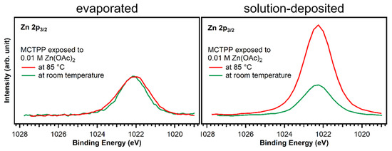 Zn 2p3/2 spectra of evaporated and solution-deposited layers of MCTPP onto TiO2(110) after metalation at room temperature (green trace) and at 85 °C (red) with aqueous zinc acetate solution. The spectra were scaled to reflect the calculated zinc to nitrogen ratios.
