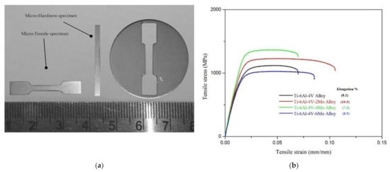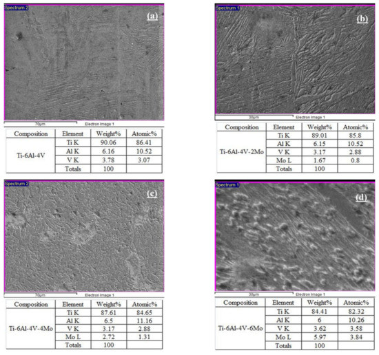 - Ti6Al4V-4Mo exhibits good mechanical values such as high yield stress (1174 MPa) and UTS (1368 MPa) with a lower percentage of elongation (7.3) than the remaining three alloys Ti6Al4V, Ti6Al4V-2Mo, Ti6Al4V-6Mo; the microhardness of Ti6Al4V-6Mo has the highest value (370 HV500) among all compositions.