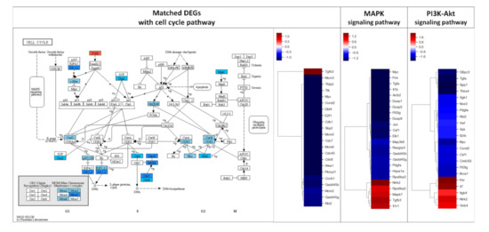 DEGs exhibiting 2-fold changes were further analyzed using the KEGG pathway database to evaluate the effect of AS-IV on signaling in regenerating liver tissues. Remarkably, DEGs were highly matched with three pathways including MAPK signaling, PI3K-Akt signaling, and cell cycle pathways (Table 2). The DEGs in these three pathways showed similar down-regulated patterns; overall, most matched DEGs were down-regulated (Figure 3).