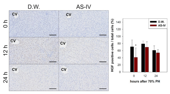 Immunostaining for HGF. HGF-immuno-positive reactions were a brown color after immunostaining. HGF peaked at 12 h after PHx. The AS-IV group showed a low expression of HGF. Hematoxylin was used as a counter stain. (Scale bar indicates 100 μm, CV: central vein, n = 3, mean ± standard deviation, *: p < 0.05).