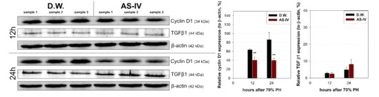 DEGs were further analyzed via the KEGG pathway database to investigate the effects of AS-IV on proliferative signaling. Three signaling pathways (MAPK signaling pathway, PI3K-Akt signaling pathway, and cell cycle pathway) were down-regulated by AS-IV (Table 2, Figure 3). Other researchers have also reported similar down-regulation of MAPK signaling by AS-IV [45,46,47]. Decreased hepatocyte growth factor (HGF, hepato-proliferative signal molecule) and cyclin D1 (proliferation marker protein) expression also suggest the same anti-proliferative effects (Figure 4 and Figure 5). Furthermore, AS-IV could affect the growth termination signal as well as could affect proliferative signal. Our extended study results show increased level of transforming growth factor β1 (TGF β1, growth termination signal) in the liver 24 h after PHx (Figure 6). In summary, AS-IV was revealed to have anti-proliferative effects in the regenerating liver via changes in gene expressions and protein expressions related to cell division and proliferative signals.