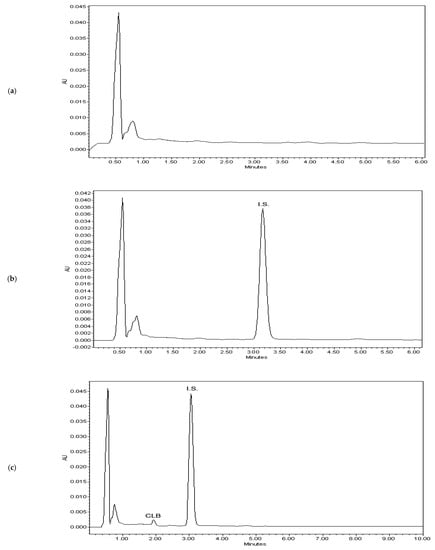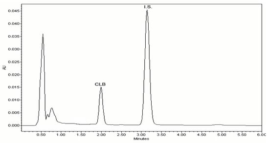 System suitability was determined before the sample analysis. Six solutions containing 15 µg/mL of CLB and 15 µg/mL of I.S. were prepared in methanol and injected onto the column. The similarity of peak area ratios of CLB to I.S. and similarity of retention times of both CLB and I.S. were taken into account.