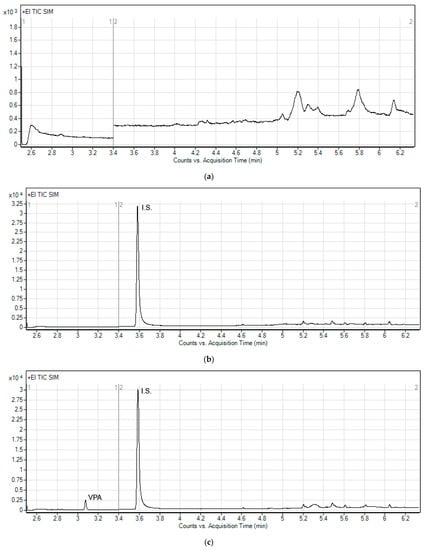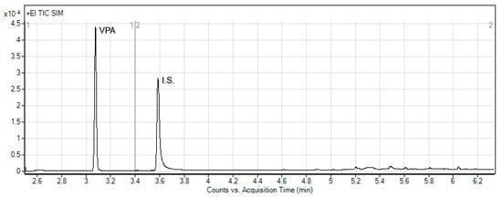 During the development of the method, the GC and MS parameters were optimized as well. The optimal choice of the SIM ions was based on the ion mass spectra of VPA and benzoic acid (I.S.). It provided three SIM ions for VPA (m/z 159, 116, and 87) and three ions for benzoic acid (m/z 136, 105 and 77), which were applied for quantitative determinations. It was found that the optimized GC-MS procedure in the SIM mode clarified the chromatograms and provided the single peaks of VPA and I.S. (Figure 4).