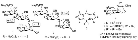 The recognition of the crucial role of heparanase enzyme, an endo-β-D-glucuronidase able to degrade heparan sulfate (HS) in the extracellular matrix and basement membranes, in a number of pathological processes, such as metastasis and angiogenesis, has triggered the development of heparanase inhibitors [1,2,3,4,5,6]. Among these inhibitors PI-88, a mixture of functionalized mannose oligosaccharides, i.e., 1, 2, (Figure 1), that potently inhibited heparanase and in vitro angiogenesis, has been considered as a promising candidate and has received considerable attention [7]. On the other hand, fluorescent labeling of biomolecules has been recognized as a research topic of great significance, since such labeling facilitates the investigation of glycoconjugates and their interaction in biological systems at high sensitivity [8,9,10,11,12]. Among the types of fluorescent dyes commonly employed as tags, borondipyrromethene (BODIPY, 4, 4-difluoro-4-bora-3a, 4a-diaza-s-indacene) dyes, e.g., 3 (Figure 1) have excelled. Several reasons can be cited for this preference: their high fluorescent quantum yields (∅), excellent photochemical and chemical stabilities, and, arguably, the relatively facile modulation of their photophysical and/or chemical properties by means of synthetic postfunctionalization of their indacene core [13,14,15,16,17,18].
