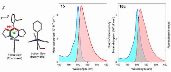 Absorption (in blue) and normalized fluorescence (in red) spectra of BODIPY 15 and its glycosylated derivative 16a in diluted solution of ethyl acetate. The spectral profiles of 10 fully resemble those of 16a. The excited state optimized geometry of 15 in two different views is also enclosed with key dihedral angles to show the bending of the chromophore.