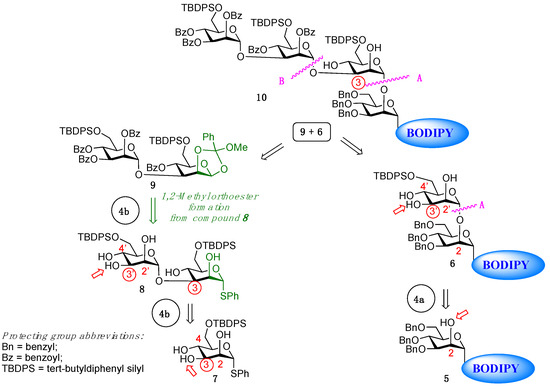 Several synthetic approaches to analogues of tetra- and pentasaccharides 1 have already been reported [22,23,24,25,26,27,28]. In those approaches, different types glycosyl donors have been employed. We have been interested in the use of 1,2-methyl orthoesters (MeOEs) [29,30,31,32,33] as an inexpensive alternative to Fraser–Reid’s n-pentenyl orthoester glycosyl donors (NPOEs) [34,35,36]. The former derivatives were shown to display good regioselectivity, similar to that of NPOEs [31]. Accordingly, our convergent 1 + 1 + 2 approach to BODIPY-tagged tetramannan, 10 (Scheme 1) was based on our previous studies on the selective mono-glycosylation at position O-3 in mannopyranose substrates possessing a 2,3,4 triol moiety, i.e., 6, 7 (Scheme 1), with MeOE glycosyl donors, 4a, 4b, and 9 [31]. Thus, our strategy involved two glycosidic disconnections A and B (Scheme 1). Disconnection A (Scheme 1), leading to BODIPY-disaccharide 6, was envisioned by glycosylation of a benzylated mannopyranoside 5, exposing only one hydroxyl group (O-2) for the glycosyl coupling, with MeOE donor 4a. On the other hand, disconnection B (Scheme 1) was imagined by regioselective mono-glycosylation of triol 6, at position O-3’, according to precedents from our research group [31], by a disaccharide MeOE donor, 9.