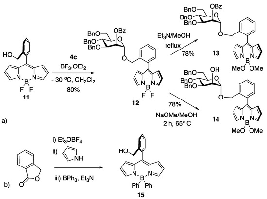 (a) Glycosylation of BODIPY 11 with MeOE 4c and saponification attempts; (b) one-pot synthesis of 4,4-diphenyl BODIPY 15.