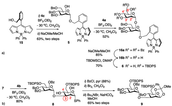 The synthetic routes to the two fragments in the convergent approach to PI-88 tetrasaccharide analogue 10, glycosyl acceptor 6 and glycosyl donor 9, are depicted in Scheme 3a,b. Thus, glycosylation of hydroxymethyl BODIPY 15 with benzylated MeOE 4c, followed by saponification (NaOMe/MeOH), led to BODIPY-mannopyranoside 5 (Scheme 3a). The latter was then glycosylated with tri-O-benzoyl MeOE 4a, to yield BODIPY disaccharide 16a in moderate yield (52%). Next, protecting group manipulations in compound 16a, including de-O-benzoylation leading to tetraol 16b, and selective monosilylation at the primary hydroxyl group at O-6’ in the latter [terbutyldiphenylsilyl chloride, 4-dimethylaminopyridine (DMAP), in dimethyl formamide (DMF)] produced 2’,3’,4’-triol 6, (Scheme 3a).