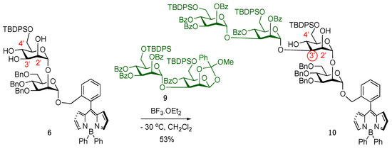 In summary, we developed a convergent, efficient, synthetic strategy to BODIPY-labeled PI-88 tetrasaccharide components (10) [46], which serves to illustrate the scope and usefulness of MeOEs as glycosyl donors. The inclusion of the BODIPY-tag from the beginning of the synthesis facilitates the visual recognition (thin-layer chromatography, TLC) of the labeled-saccharide acceptor and the glycosylated products therefrom, among the rest of the non-fluorescent side-products arising from side-reactions of the MeOE glycosyl donor [36]. This feature becomes particularly appealing when excess amounts of glycosyl donors are required to lead the glycosylation to completion. On the other hand, the chemically stable 4, 4’-diphenyl BODIPY derivative (15), used as a tag, displayed good fluorescent properties and photostability under strong and prolonged irradiation, and was also able to withstand all reaction conditions employed in the synthetic sequence leading to 10 [20]. Our results also indicate that the incorporation of carbohydrate subunits at the ortho-hydroxymethyl group of the C-8-aryl substituent has a beneficial effect on the, already, good photophysical features of the BODIPY dye.