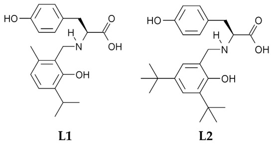 The Mannich reaction between disodium L-tyrosinate and thymol to produce L1 yielded a light-brown solid, which was isolated after the adjustment of pH reaction medium pH to ca. 2 with HCl. This allowed the removal of unreacted tyrosine, its self-condensation products, and the unreacted phenol by thorough washing with water, diethyl ether and/or petroleum ether. However, the reaction product yielded very complex NMR spectra (see Figure S1) and its structure could not be properly elucidated. This was attributed to polycondensation reactions between thymol and tyrosine, given that thymol has ortho and para positions available for reaction. As a result, no further attempts of syntheses of involving thymol were carried out.
