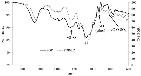 Analysis of the porphyrans by FTIR showed sulfate ester S=O stretching bands at ca. 1261 and 1230 cm−1 for POR, while for POR-L2 these signals appeared at ca. 1253 and 1226 cm−1 (Figure 3, see Figure S5 for the full spectra and Table 1 for selected frequencies). The bands in the 1100–1000 cm−1 range were assigned to pyranose ring stretching vibrations. The band at ca. 933 cm−1 was attributed to the presence of 3,6-anhydrogalactose (3,6-AG) residues in the polysaccharide structure, while the weak band at ca. 816 cm−1 was assigned to primary alkyl sulfate groups [14,15,60,61,62,63]. However, the N-H, aromatic C-H and COO stretching bands could not be observed in POR-L2. The existence of the sulfate signals in POR-L2 suggests that not all the sulfate moieties may be labile under the reaction conditions used for the immobilization of L2.