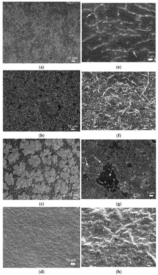 Electron microscope images show that all produced films are continuous (Figure 7a–d); high magnification images (Figure 7e–h) enlighten different microstructural features depending on composition.