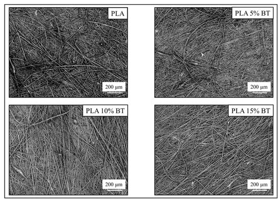 The laser micrographs shown in Figure 1, obtained at 10× of magnification, revealed how the fibers are distributed on all four samples before the aging treatment. The PLA matrix and PLA 5% BT surfaces presented a random orientation of the fibers, while the other two samples presented a more oriented direction. Furthermore, PLA 10% BT and PLA 15% BT showed an increase in fiber diameter while, in the other two classes, the fibers exhibited different sizes. Few clusters related to the drying of polymers droplets on the tip of the needle during the electrospinning process are visible, except for the PLA.