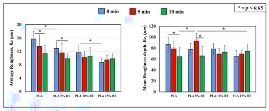 Studying the profilometry of images collected at 150× of magnification, the average roughness value, Ra, and mean roughness depth, Rz of the four tested surfaces were calculated and their differences were statistically validated. The values are reported in Figure 2. A decrease of Ra is visible when implementing the amount of barium titanate. No-aging treated PLA 15% BT showed lower values than the other samples, especially PLA, which possessed the highest one. An important feature that emerged is that the aging treatment did not influence the roughness of PLA 10% BT and 15% BT; in fact, no statistical variations have been reported over time during the UV/O3 exposure for these two classes. Instead, in PLA and PLA 5% BT, a reduction of Ra has been detected after 10 min of UV/O3 treatment. Rz values did not show the same trend. Comparing the four untreated substrates, no statistical differences were observed. PLA 10% BT and PLA 15% BT also did not show any variations connected with the aging test. PLA 5% BT treated for 5 min exhibited the highest Rz, while at 10 min, the value was in the same range as the ones detected for PLA 10% BT and PLA 15% BT. Considering PLA without any fillers, the analysis showed a clear decrease over time of aging treatment, especially at 10 min.