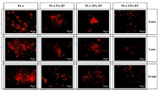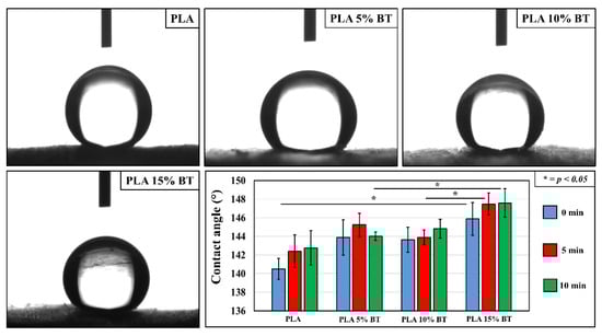 No differences were observed between the PLA matrix, PLA 5% BT, and PLA 10% BT substrates even though, in the latter two, the contact angle values slightly increased. PLA 15% BT showed an improvement in hydrophobicity almost up to a superhydrophobic surface. In particular, this class of composite showed remarkable variation after 5 and 10 min of aging compared to PLA 10% BT and PLA 5% BT, respectively.