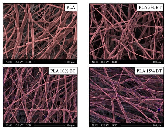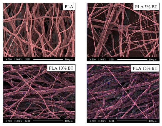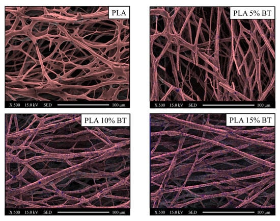 The addition of BT influenced the morphological properties of the fibers. Increasing fiber diameter with a concurrent decrease of density of fiber nets, as a reduction of roughness associated with the development of a more oriented distribution, occurred with the presence of BT. The particles were homogeneously distributed on the fibers also after the aging test.