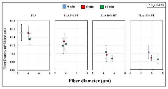 The blue spots were significantly observable, especially in fibers with 10% and 15% of BT powder. In PLA 5% BT, the fillers were concentrated in a few areas and this did not change during the aging test and influenced the morphology and the stability of the fibers. In fact, especially the PLA matrix and PLA 5% BT after 10 min showed several broken fibers. In the other two classes of samples, despite undergoing the same treatment, the same changes did not occur. Furthermore, some fibers were subjected to UV/O3 for 10 min attached together, forming some big bundles with the same orientation but presenting less BT on the surface. The diameter and the density of fibers have been calculated and reported in Figure 7.