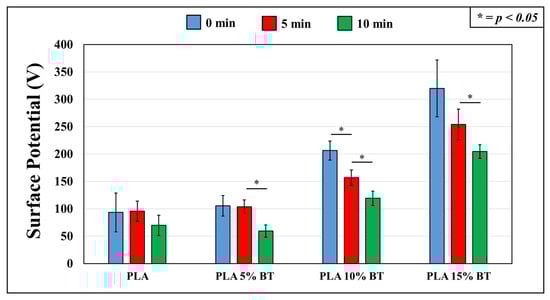 The plot displayed in Figure 8 shows that PLA 15% BT had the highest potential, while PLA matrix and PLA 5% BT presented the lowest one. The addition of BT dispersed in the matrix conferred a sharp increase of positive potential, especially with 10% and 15% of fillers. The aging test influenced the charge: a reduction of values was visible after 10 min in PLA 5% BT and PLA 15% BT, and after 5 min in PLA 10% BT. No variations were detected in the sample of PLA without BT.