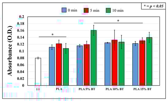PLA 10% BT samples presented a low amount of bacteria, and no differences emerged between each other. At 24 h of exposure, the highest OD value belonged to PLA untreated, whereas PLA 10% BT and PLA 15% BT displayed the lowest OD values. PLA 15% BT treated for 5 min had a higher amount of bacteria than the untreated and treated for 10 min. However, the values were lower compared with PLA 5% BT and also PLA. PLA 5% BT had intermediate OD values, which did not show any statistical differences in the aging treatment. Another aspect that emerged was a clear reduction of bacterial viability on PLA surfaces subjected to UV/O3 at 5 and 10 min. Note that the OD values samples with 10% and 15% of fillers were lower at 24 h than at 12 h. Only PLA presented an increase for all the OD values. In the case of PLA 5% BT samples, the untreated and the one subjected to 5 min of UV/O3 showed a drastic decrease, while for the sample treated for 10 min, the OD was higher at 24 h than 12 h.