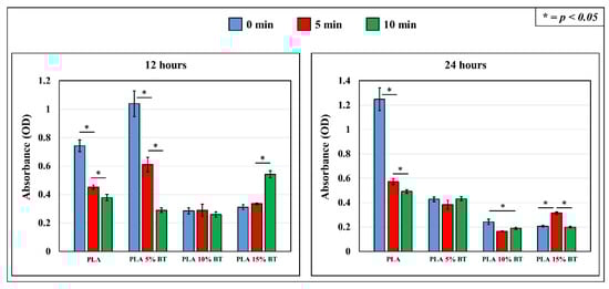 As shown in Figure 10, bacterial cell viability CTC was performed at two different times, 12 and 24 h, respectively. At 12 h, PLA 5% BT untreated showed the highest OD value, indicating the largest living bacteria number among the samples; PLA untreated presented a high OD comparing with the rest of the samples. However, bacterial viability decreased drastically in these two types of samples when the surface was subjected to UV/O3. The viability also decreased over time, especially for PLA 5% BT, where a statistical difference was observed between the samples after 5 min and then after 10 min. In the case of PLA 15% BT, the trend was opposite with an increase of OD values related to the sample treated for 10 min comparing with the other two samples.