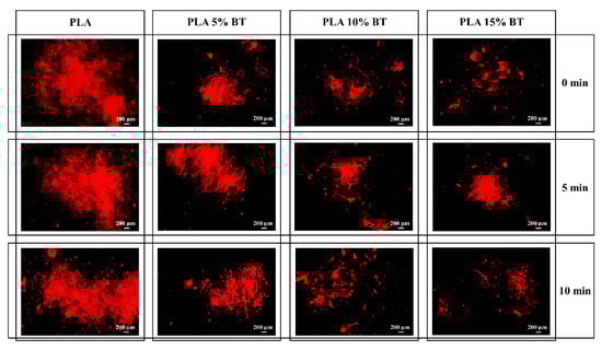 At 12 h, the three PLA matrix samples presented the highest concentration of bacteria. The red spot size appeared bigger on PLA than the other samples. PLA 15% BT surfaces, independently by the aging tests, showed a random distribution of few spots, while in the case of PLA 5% BT and PLA 10% BT the living bacteria were detected in localized areas forming aggregated clusters. At 24 h, the PLA matrix experienced a clear increment of bacterial amount connected with proliferation and biofilm formation. All the PLA surfaces, independently from the aging treatment, were covered by bacterial biofilm. The other samples, at 24 h, showed a higher amount of red-stained areas comparing with the one collected at 12 h, which indicates a slow bacterial proliferation. All the PLA with BT presented localized areas of bacteria growing around the surfaces, but these were not dimensionally comparable with the ones detected on the PLA matrix.