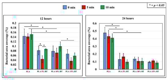 At 24 h, no statistical differences emerged between the fibers functionalized with BT and treated under UV/O3. Between 12 and 24 h, a general increase of bacterial area coverage occurred, indicating cellular proliferation on PLA 5% BT and especially on PLA matrix. In the case of the other two composites, even if a slight no-significant increase occurred, no statistical differences were displayed.