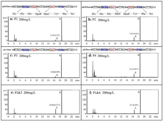 Several HpaBC expression vectors were constructed, and a two-step fermentation was performed using N as a substrate (final concentration of 200 mg·L−1); N and E were detected by HPLC [18]. The HPLC results showed that the strains had remarkably different ortho-hydroxylation activities (Figure 2). The enzyme activities of the strains carrying the P1 and P3 (containing HpaB in MCS-1 and HpaC in MCS-2) plasmids were significantly lower than those of strains carrying the P2 and P4 (containing HpaC in MCS-1 and HpaB in MCS-2) plasmids. For example, the conversion efficiency of the P2-carrying strain (7.47 ± 0.41%,15.81 ± 0.86 mg·L−1) was 3.81-fold higher than that of the P1-carrying strain, and that of the P4-carrying strain (6.3 ± 0.30%,13.36 ± 0.63 mg·L−1) was 2.86-fold higher than that of the P3-carrying strain. In addition, we also co-expressed pRSFDuet-HpaC (MCS-2) and pETDuet-HpaB (MCS-2), and the results showed very low ortho-hydroxylation activity (results not shown). These findings suggested that when the HpaC gene was attached to the MCS-2 locus with an S-Tag (15 amino acids) at the carboxyl-terminus, the enzyme activity could be affected.