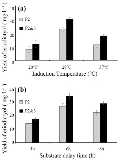 To determine the optimal substrate delay time, bacterial growth medium was supplemented at 28 °C for 4 h, 6 h and 8 h after IPTG induction. The conversion efficiency of E increased gradually with increasing induction time and then reached the production peak at 6 h after IPTG induction (Figure 3b). The conversion efficiencies of the P2&3- and P2-carrying strains reached 16.47 ± 1.01% and12.50 ± 1.00% (product concentration was 33.98 ± 2.12 mg·L−1 and 26.48 ± 2.12 mg·L−1), respectively. After 8 h of induction, the conversion efficiencies of the P2&3- and P2-carrying strains decreased to 13.47 ± 00.63 and 10.29 ± 0.71% (product concentration was 28.53 ± 1.33 mg·L−1 and 21.81 ± 1.57 mg·L−1), respectively. These results show that it is possible to achieve high-density culture of recombinant bacteria and high expression of products at the optimal temperature (28 °C) and IPTG induction time (6 h). Therefore, we chose these fermentation conditions for the following study.