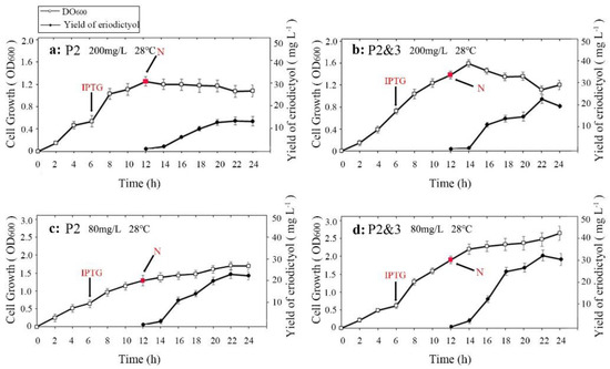Previous studies have shown that when the medium contains high concentrations of phenylpropanoic acids or flavonoids, the growth of bacteria was significantly inhibited [20,21]. This experiment was conducted to study the effect of the initial concentration of N on the catalytic efficiency of the P2&3- and P2-carrying strains. As shown in Figure 4a,b it can be seen that at 200 mg·L−1 concentration of N, the cell growth rate was significantly reduced 12 h after substrate addition. Figure 4a shows that the cell concentration of the P2-carrying strain was the lowest, and the final OD600 (cell concentration) was only 1.201 ± 0.09, while the conversion efficiency of E was 5.81 ± 0.95% (12.32 ± 2.01 mg·L−1). Figure 4b also shows that the growth curve of the P2&3-carrying strain showed the most obvious downtrend, and the OD600 of the P2&3-carrying strain was 1.597 ± 0.06. When the initial concentration of N was 80 mg·L−1 (Figure 4c,d), the growth of the P2 and P2&3-carrying strains did not decrease with the addition of the substrate. The final OD600 of the P2-carrying strain reached 1.73 ± 0.08, and the concentration of E was 27.63 ± 2.31% (23.40 ± 1.96 mg·L−1). The final OD600 of the P2&3-carrying strain was 2.46 ± 0.18, and the highest conversion efficiency of E reached 38.49 ± 2.77% (32.60 ± 2.35 mg·L−1); these results indicate that a high initial concentration of N produces a certain degree of inhibition on the growth of the bacterial strains.
