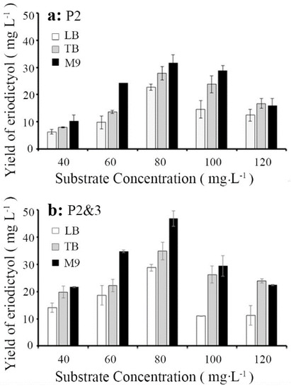 We further studied the effects of substrate concentration and culture medium on the catalytic ability with N as a substrate based on the above results. Three types of media (including LB, TB and M9) and five substrate concentrations were selected for this study (Figure 5). The results showed that the ideal substrate concentration was 80 mg·L−1, and the optimal medium for E production was M9. The highest conversion efficiency of E of the P2-carrying strain was 39.58 ± 3.6% (31.67 ± 2.89 mg·L−1), with a final substrate concentration of 80 mg·L−1 in M9 medium, followed by that in TB medium (27.87 ± 2.52 mg·L−1), while that in LB medium was the lowest (22.72 ± 1.14 mg·L−1). The most exciting result was that the conversion efficiency of E produced by the P2&3-carrying strain in the conversion efficiency was up to (46.84 ± 2.85 mg·L−1). Hence, M9 medium and 80 mg·L−1 N were chosen as the optimal medium and substrate concentration, respectively, for the subsequent study.