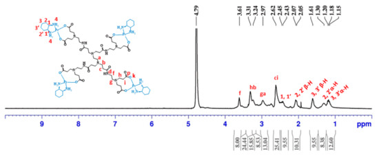 After, four half-generations of anionic PAMAM dendrimers (G0.5–G3.5) were successfully coordinated to the bis-aquated DACHPtCl2 in a bidentate form. The prepared metallodendrimers were obtained with a good yield (G0.5COO(DACHPt)4: 92%; G1.5COO(DACHPt)8: 77%; G2.5COO(DACHPt)16: 78%; G3.5COO(DACHPt)32: 60%). Again, the products were fully characterized by different techniques that included NMR (1H, 13C, and 1⁹⁵Pt-NMR), FTIR, UV–vis, and fluorescence spectroscopy, zeta-potential, and mass spectrometry. In the 1H-NMR experiments, the signal of deuterated water (D2O) was used as an internal reference, whereas potassium tetrachloroplatinate(II) was used as an external reference in the 1⁹⁵Pt-NMR experiments. Figure 2 shows the expected 1H-NMR spectrum of G0.5COO(DACHPt)4 with the characteristic signals of the anionic PAMAM dendrimer structure between 2.62 and 3.61 ppm and the signals of the cyclohexyl group of DACHPt fragment between 2.43 and 1.18 ppm.