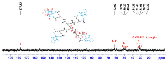 The 13C-NMR spectrum (Figure 3) also presents the characteristic signals of the anionic PAMAM dendrimer’s structure and those corresponding to the cyclohexyl of the DACHPt moiety. The signals at 30.73, 31.40, 34.35, 48.61, 50.27, and 50.94 ppm are from the anionic PAMAM dendrimer scaffold. The signals at 23.32, 31.01, and 62.02 ppm are from the cyclohexyl group of DACHPt. Compared to pristine half-generation anionic PAMAM dendrimers, a downfield shift was observed in the carboxylate group’s signal (from 174.69 to 177.83 ppm), indicative of metal complex coordination [30]. Moreover, the coordination of DACHPt to the anionic PAMAM dendrimers was evaluated by TOF-MS (ESI positive mode or MALDI, Table S1 and Figures S6–S9). Despite the characterization difficulties experienced since DACHPt metallodendrimers are, in general, hygroscopic, several fragments from the parent metallodendrimers were identified by TOF-MS, confirming the functionalization with DACHPt. (See Section 3.2).
