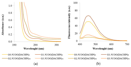 (a) UV–vis spectra of DACHPt metallodendrimers at a concentration of 40 µM and (b) emission (λex = 380 nm) of DACHPt metallodendrimers at a concentration of 500 µM in UPW.