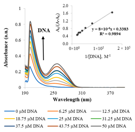 Representative UV–visible spectrum of the G2.5COO(DACHPt)16 metallodendrimer with increasing concentrations of CT-DNA (0, 6.25, 12.5, 18.75, 25, 31.25, 37.5, 43.75 and 50 µM) in 5 mM Tris-HCl/50 mM NaCl at pH 7.4. The inset corresponds to the plot of A0/(A−A0) versus 1/[DNA], which is used to determine the binding constant. The arrow indicates the direction of increasing the concentration of DNA.