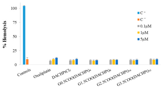 The hemolysis assay was used to evaluate the interaction of the free drugs and DACHPt metallodendrimers with red blood cells. The obtained results (Figure 6) show very low hemotoxicity levels for all situations studied if we compare the values of released hemoglobin with those of the negative control. In the case of oxaliplatin, hemotoxicity slightly increases with concentration with a release of hemoglobin around 12% at the maximum concentration used (5 µM), which is in line with the reported oxaliplatin hematological toxicity [7]. At this concentration, both the DACHPtCl2 and the metallodendrimers also present a low hemolysis percentage (7–10%). In fact, at least in the concentration range studied, an increase in dendrimers generation and, consequently, an increase in the number of metallic centers does not induce a significant variation in hemotoxicity values.