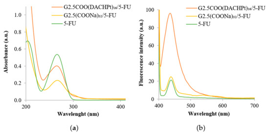 Moreover, the UV–vis spectrum of the G2.5COO(DACHPt)16/5-FU system was recorded. The 5-FU encapsulation in the metallodendrimer was confirmed (Figure 7a) by a decrease observed in absorbance intensity at 266 nm, which is the maximum absorption wavelength of 5-FU [46]. The decrease in the absorbance was also observed in the case of G2.5(COONa)32. Furthermore, fluorescence emission spectra were also performed. As can be seen in Figure 7b, 5-FU and G2.5(COONa)32/5-FU present similar fluorescence intensity, whereas it is much higher for the G2.5COO(DACHPt)16/5-FU system (in this case, fluorescence intensity is five times greater than in the G2.5(COONa)32/5-FU system).