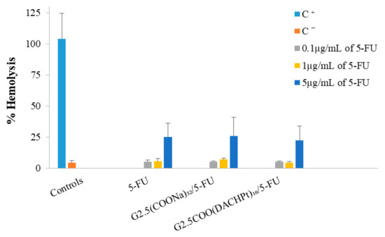 The results of hemolysis (Figure 8) show that the G2.5COO(DACHPt)16/5-FU system and the 5-FU are not hemotoxic at concentrations 0.1 and 1 µg/mL, only achieving ca. 5% of hemolysis. Nonetheless, when we increase the concentration to 5 µg/mL, the percentage of hemolysis significantly increases to a value between 24–26% for all the compounds considered, which should be attributed to 5-FU presence.