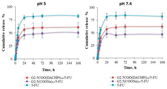From Figure 9, we can conclude that, after an initial faster release of the 5-FU drug from G2.5COO(DACHPt)16/5-FU and G2.5COO(COONa)32/5-FU systems, drug release starts to be sustained along time, achieving maximum values of 57% and 46% of cumulative release after 24 h, respectively. That is, drug release seems to be higher for the metallodendrimer than for the G2.5(COONa)32 dendrimer. On the other end, decreasing the pH value does not affect drug release, which means that our system is not sensitive to the pH, which, as it is known, may change towards more acidic values in the microtumor environment.