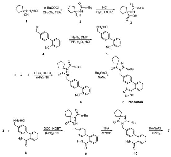 - Prasada Rao, K.V.V.; Dandala, R.; Handa, V.K.; Rao, I.V.S.; Rani, A.; Naidu, A. Improved methods for the synthesis of irbesartan, an antihypertensive active pharmaceutical ingredient. Synth. Commun. 2007, 37, 2897–2905. [Google Scholar] [CrossRef]